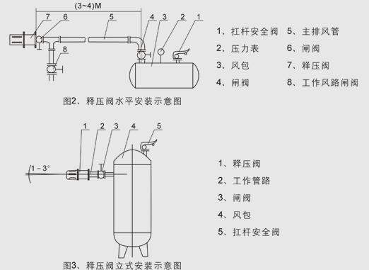 5.1 释压阀安装于空气压缩机系统中风包出口管路正对气流向上,距风包出口为3-4米。释压阀与风包间须安装闸阀。空气压缩机风包水平放置安装时如图2,空气压缩机风包立式安装如图3。